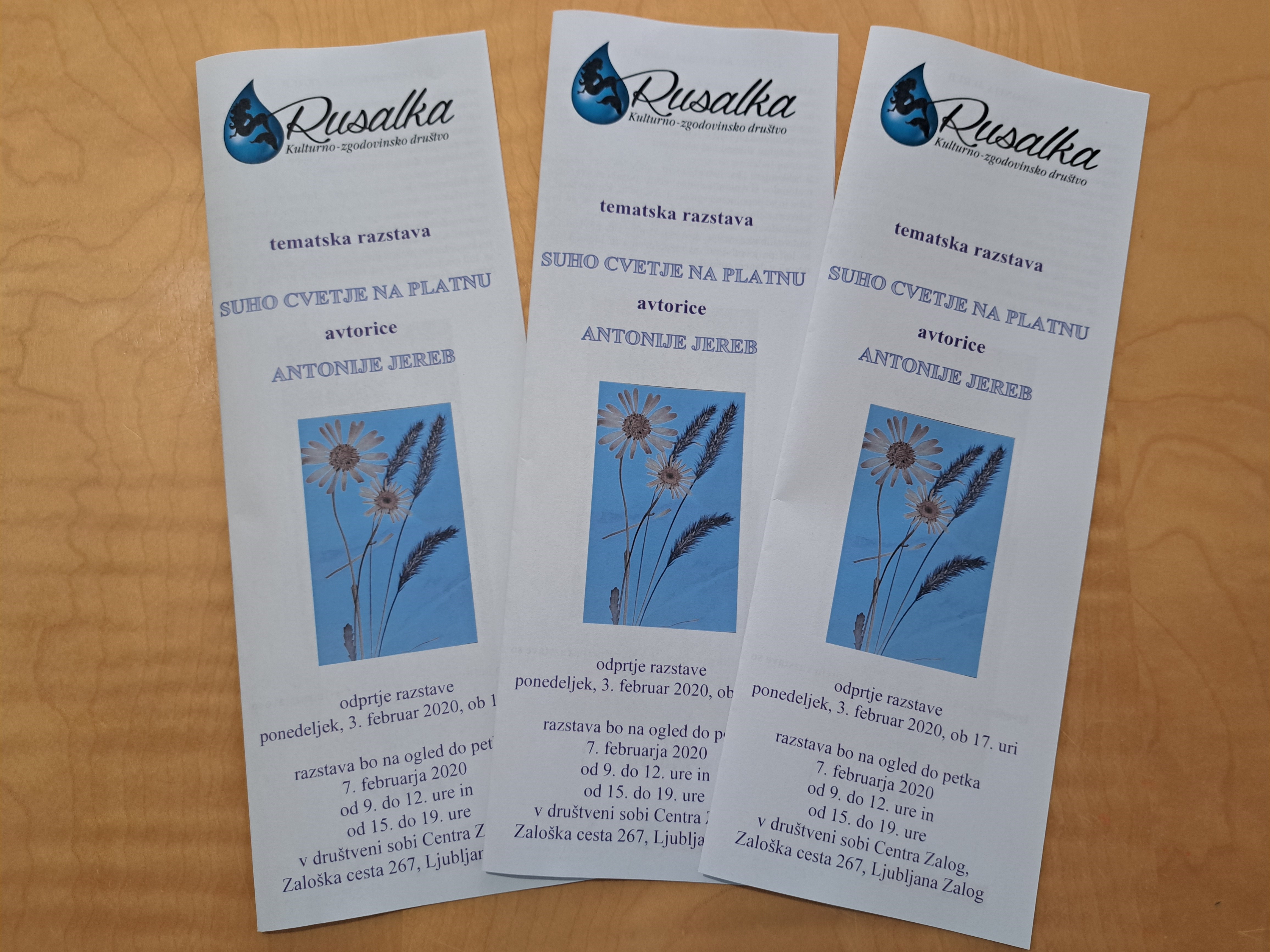 V ponedeljek, 3. februarja 2020, je bila ob 17. uri odprta tematska razstava Antonije Jereb SUHO CVETJE NA PLATNU. Za glasbeno obogatitev prireditve je poskrbel kantavtor Janez Ogris, rusalke pa za recitacijo pesmi.