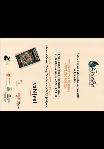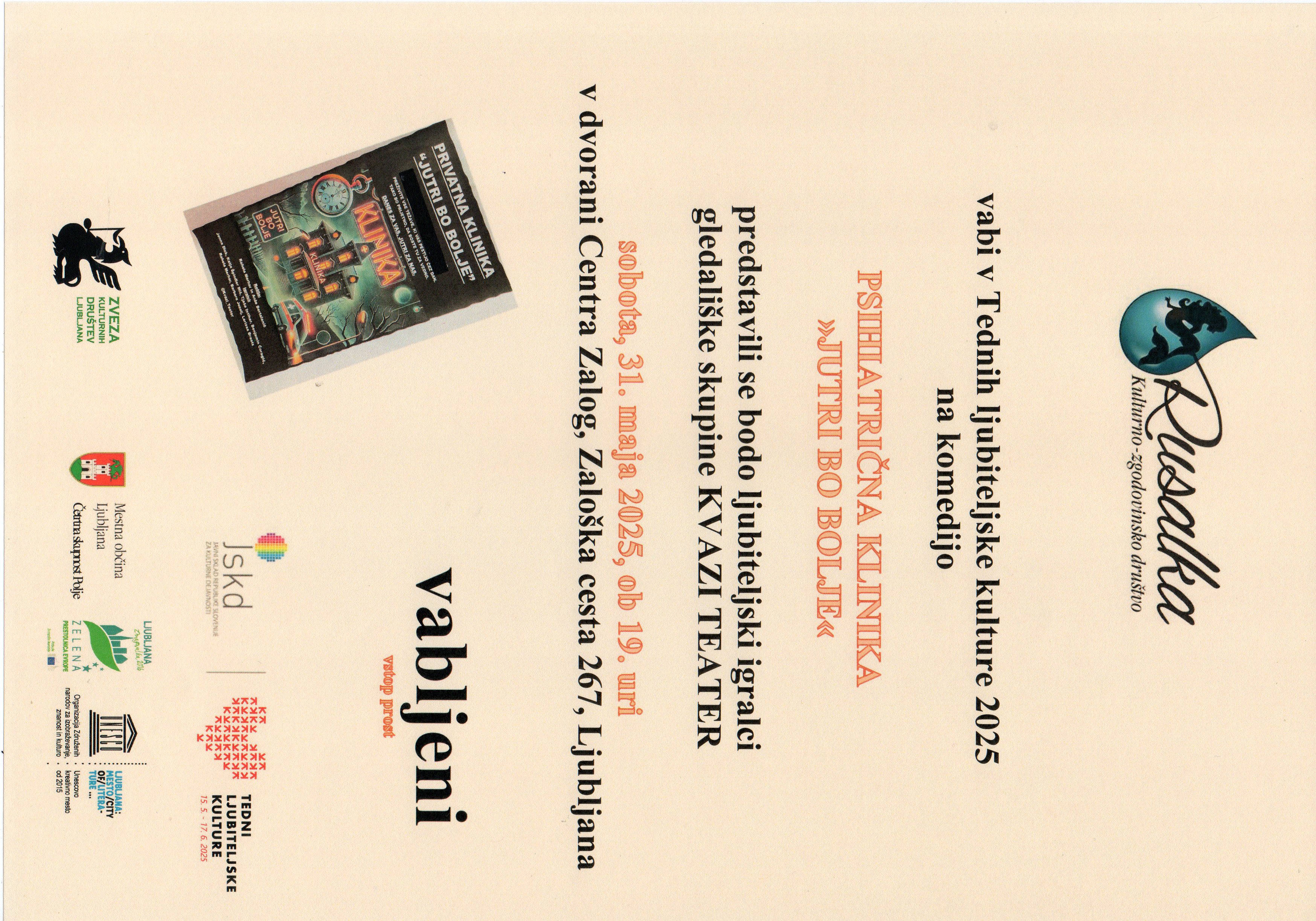 pravijo, da je smeh pol zdravja. Če pregovor tako pravi, bo že držalo. Ko se bomo začeli poslavljati od meseca maja, ste vabljeni v Center Zalog. Tam bo v soboto, 31. 5. 2025, ob 19. uri zagotovljena doza smeha. Zvedeli bomo vse, kar se dogaja v PSIHIATRIČNI KLINIKI "JUTRI BO BOLJE".
