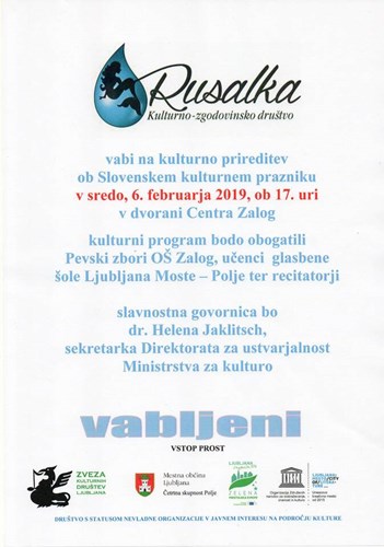 vljudno vabljeni na osrednji kulturni dogodek ob počastitvi Slovenskega kulturnega praznika. Prireditev bo v sredo, 6. februarja 2019, ob 17. uri v Centru Zalog, Zaloška cesta 267, Ljubljana Zalog.