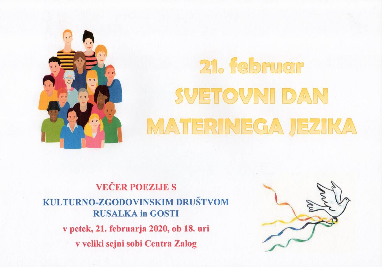 Ta dan obeležujemo tudi v Kulturno-zgodovinskem društvu Rusalka. V ta namen bomo izvedli večer poezije. Na večeru se bodo predstavili člani našega društva in številni gostje, ki živijo v Sloveniji, a prihajajo iz različnih krajev tega sveta. Pesmi bodo recitirali v svojem materinem jeziku. A, to še ni vse: "Smo si ljudje medsebojno različni ..." Morda; morda po barvi kože, veri, velikosti, jeziku ... toda vsi smo ljudje in vse to nas povezuje in bogati. Gostja večera bo slepa Mirjana, ki nam bo zapela svoje avtorske pesmi ...