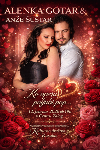 Vljudno vabljeni na veliki Valentinov koncert, ki ga boste izvedla glasbena diva, mag. Alenka Gotar in Anže Šuštar, rusalke pa bodo poskrbele za ljubezensko poezijo.